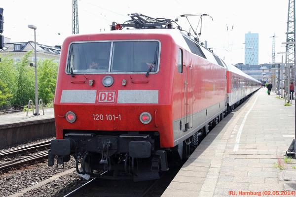 STATION: Hamburg-AltonaTRAIN TYPE: Поезд дальнего следования (IC/EC)LOCOMOTIVE: 120(DB) (120 101)COMPANY: DB FernverkehrПассажирский поезд подаётся на посадку.