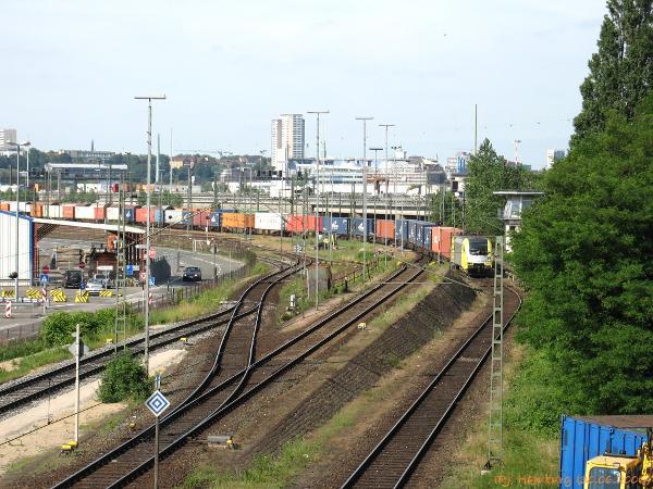 А вот из приёмно-отправочного парка отправляется контейнерный поезд.